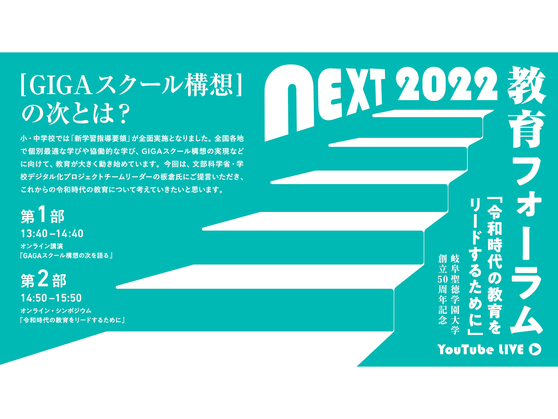 岐阜聖徳学園大学様の「教育フォーラム2022」のライブ配信用アイキャッチを制作しました。